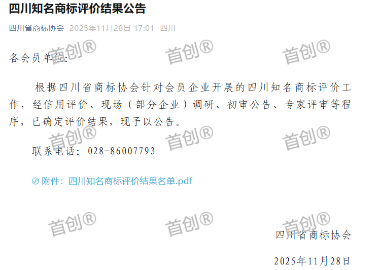 2025年11月28日,四川省商标协会发布了四川知名商标评价结果公告,首创带大家速看上榜名单!